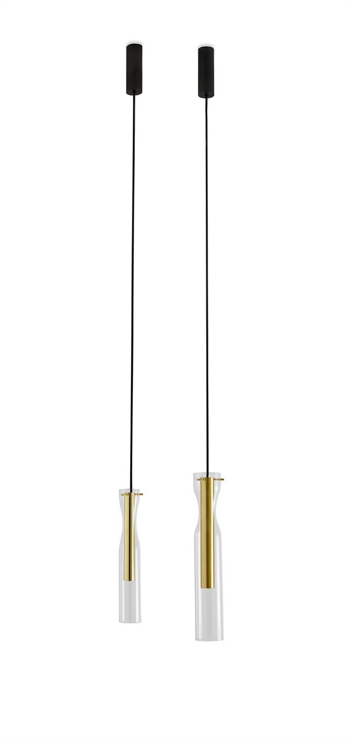 Hanging lamp with LED light (2700 Kelvin). Handshaped glass cylinders. Bright, satin, hand burnished, black chromed or coppered brass metal parts. Dimmable light. Supplied with 4mt long cable.